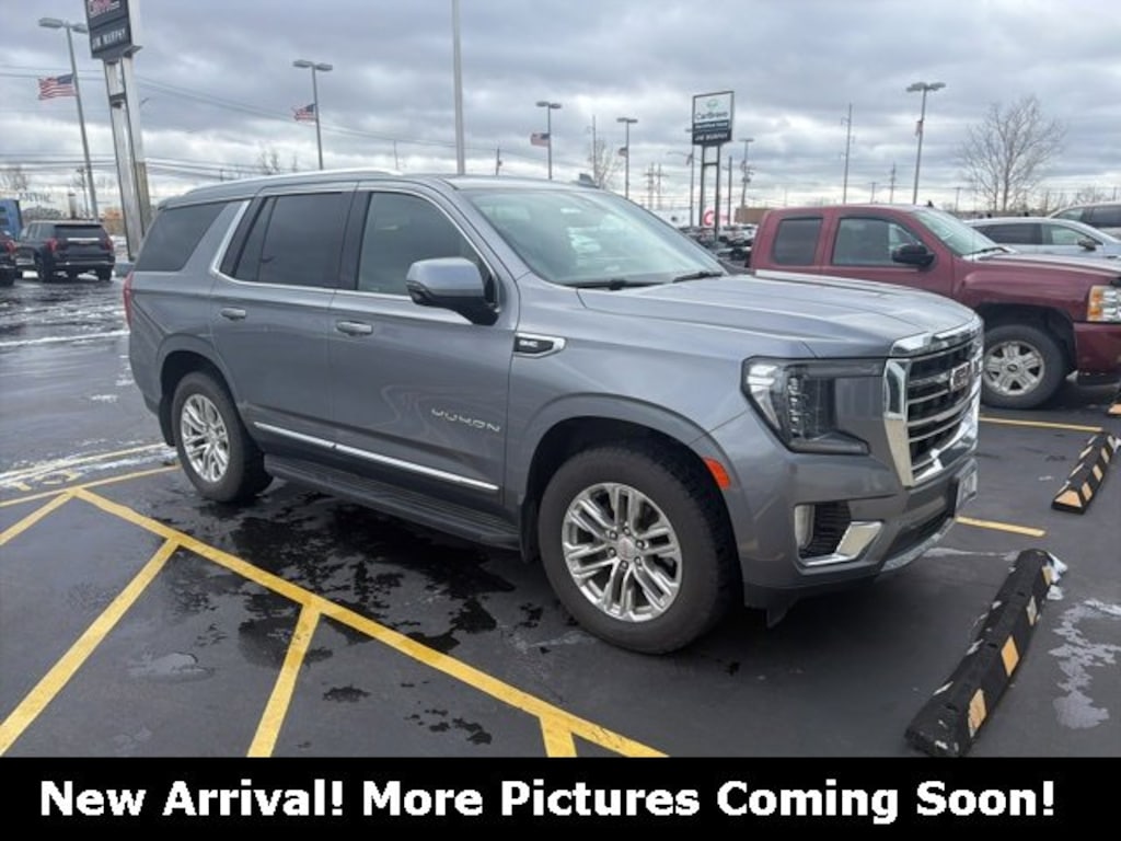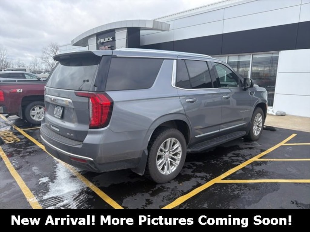 Recent Arrival! 2021 GMC Yukon SLT Satin Steel Metallic 4WD EcoTec3 5.3L V8 *CLEAN CARFAX NO ACCIDENTS*, *CARFAX 1 OWNER*, BLUETOOTH, USB / AUX INPUTS TO PLAY MUSIC, *REAR VIEW CAMERA*, *LEATHER SEATS*, HEATED FRONT SEATS, REMOTE STARTER, 4 WHEEL DRIVE - Perfect for Buffalo Winters!, *HEATED STEARING WHEEL*, 4WD, 12-Way Power Seat Adjusters, 2 Presets For Outside Rearview Mirrors, 2 Presets For Power Driver Seat, 3rd Row 60/40 Power-Folding Split-Bench Seat, 4-Wheel Disc Brakes, ABS brakes, Automatic temperature control, Bose 9-Speaker Stereo Audio System Feature, Bright Chrome Bodyside Moldings, Bright Front & Rear Door Sill Plates, Chrome Door Handles w/Body-Color Strip, Dual front impact airbags, Dual front side impact airbags, Dual-Pane Panoramic Power Sunroof, Electronic Stability Control, Extra Capacity Cooling System, Front dual zone A/C, Front fog lights, Fully automatic headlights, Hands-Free Power Programmable Rear Liftgate, HD Radio, HD Surround Vision, Heated & Ventilated Driver & Front Passenger Seats, Heated 2nd Row Outboard Position Seats, Heated Automatic Steering Wheel, Heated Driver & Front Passenger Seats, Inside Rear-View Auto-Dimming Mirror, Max Trailering Package, Outside Heated Power-Adjustable Mirrors, Power Liftgate, Power Release 2nd Row 60/40 Split-Folding Bench Seat, Power Tilt & Telescopic Steering Column, Preferred Equipment Group 4SA, Radio: AM/FM/SiriusXM w/Navigation, Rear Media & Nav Package, Rear Pedestrian Alert, Rear Seat Media System, Safety Alert Seat, SiriusXM w/360L, SLT Luxury Package, SLT Luxury Plus Package (DISC), SLT Premium Package, Steering wheel mounted audio controls, Telescoping steering wheel, Tilt steering wheel, Traction control, Universal Home Remote, Wheels: 20 x 9 6-Spoke Polished Aluminum.Jim Murphy Buick GMC - The more you shop around, the better we look!